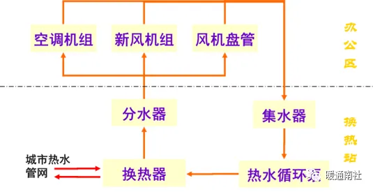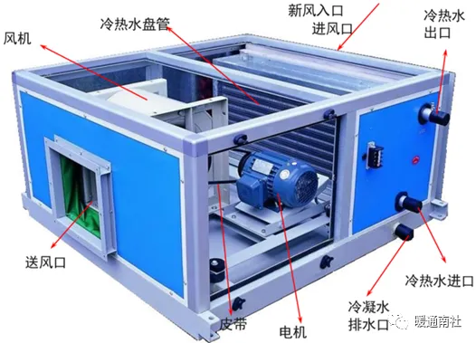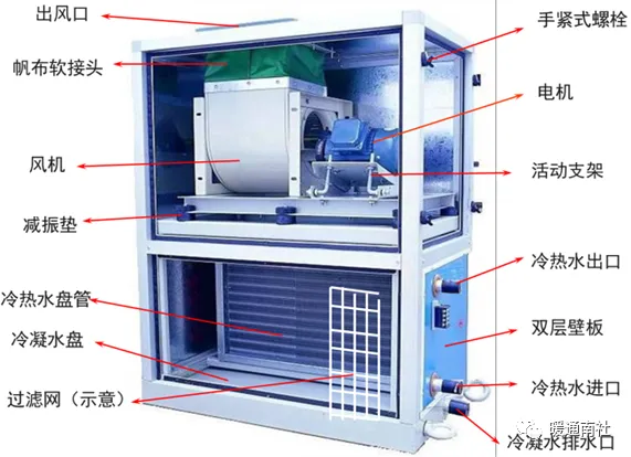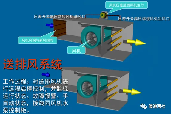 新风/空调系统:室外新风(空调是新风和回风混合)通过新风阀、过滤网,过滤杂质后与冷热水盘管热交换,然后通过风机送到房间中,实现空气质量及温度调节。