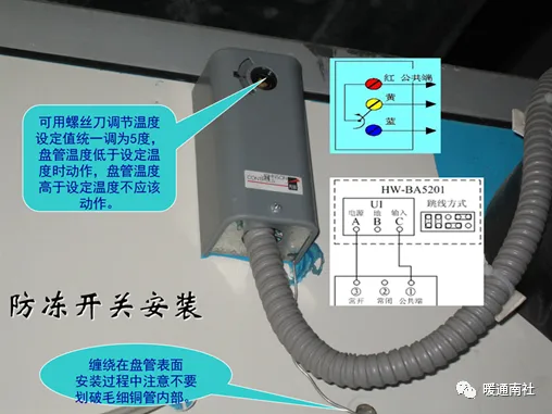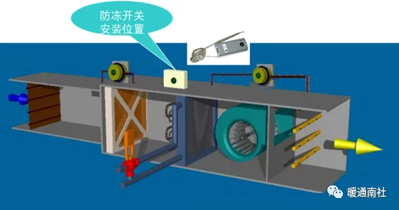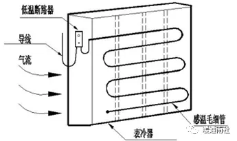 防冻开关(低温断路器)利用敏感元件进行低温监测,主要应用于新风、空调系统的低温报警及联动.在北方地区冬季气温较低,空气处理机组吸入的新风温度可能会冻裂热水盘管,因此将防冻开关的毛细管缠绕在被保护盘管背风面,如果盘管表面温度低于设定值,则该低温短路器无源开关量信号闭合,并联动机组停机。