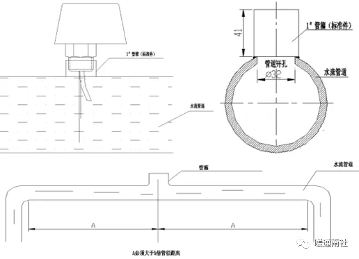 从管道侧壁开口,再焊接标尺套管,再连接流量计。