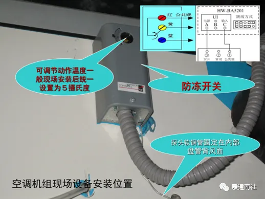 6)防冻开关:探头软铜管应均匀固定安装于表冷器盘管背风面上,不得有死弯及损坏。