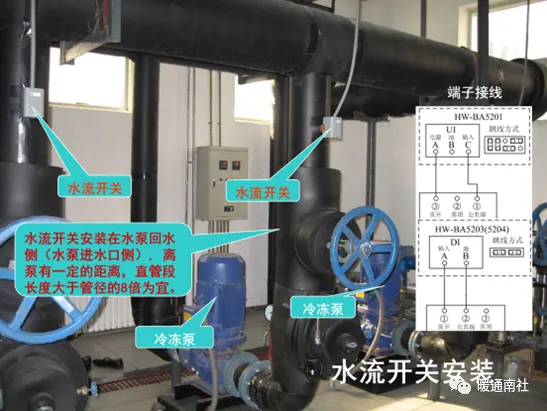 7)水流开关:水流开关必须安装在水泵回水侧(水泵进水口侧),考虑到水流的稳定性,离泵有一定的距离且直管段长度大于管径的8倍。