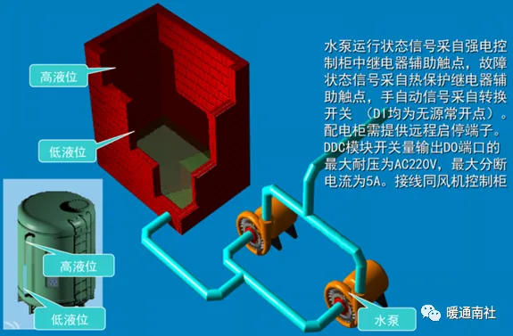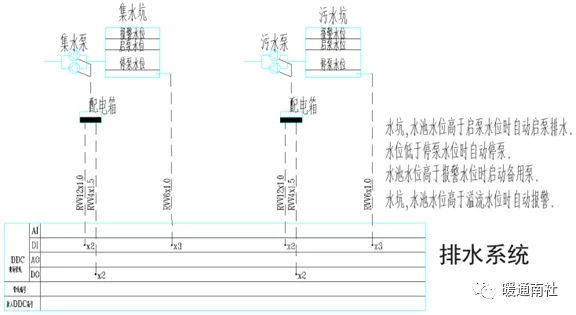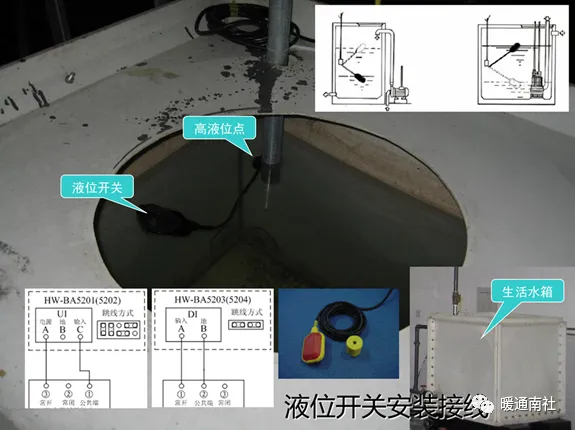 联动关系:通过液位开关或液位变送器检测水箱的水位,生活水箱是低液位报警自动启动生活水泵,高液位报警自动停止生活水泵,(排污泵启停与生活水泵相反),同时监视水泵的运行、故障、手自动状态。