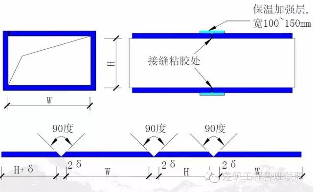 3、方形风管保温900转角 处采用45度拼装,保温板 裁900角时不要割透,预留 5mm厚作为整体转角用, 然后用胶水进行拼缝。