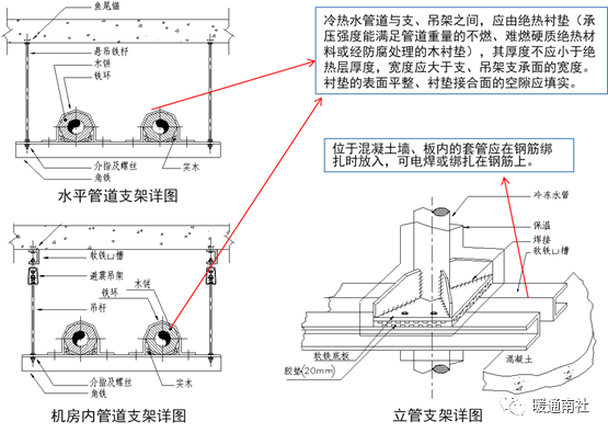 C、冷(热)媒水、冷却水系统管道机房内总干管得支、吊架,应采用承重防晃管架;与设备连接的管道管架宜有减振措施;