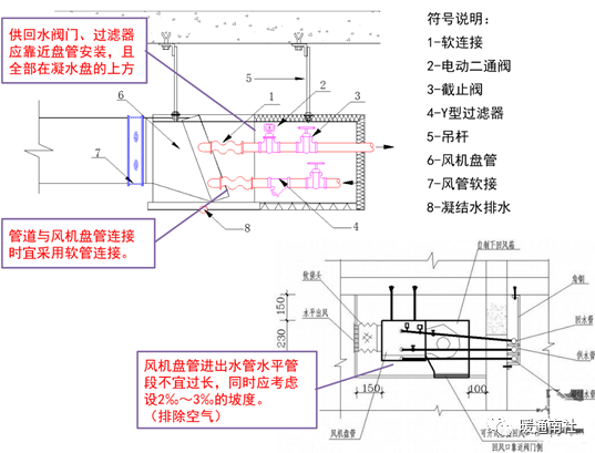 空调机组应有不小于0.008的坡度坡向凝结水的出口,凝结水管应设≥60mm水封。