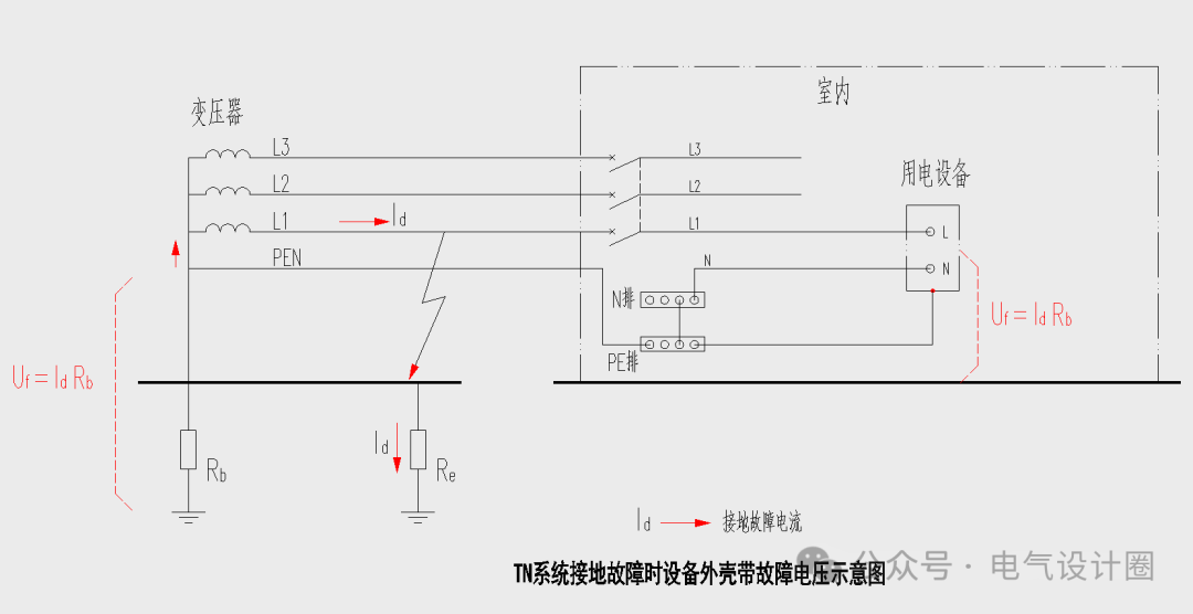 根据以上接线图可知,当L1相发生接地故障时,故障电流通过Re和Rb返回变压器,那么PEN线和PE线上的电压上升为Uf,因为用电设备外壳与PE线相连接,因此用电设备的外壳电压也上升为Uf,Uf=Id*Rb,为了使用电设备外壳的电压不超过50V的安全电压,就必须要求Uf小于等于50V,即Uf=Id*Rb≤50V。[公式二]