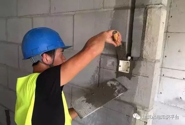 线盒固定前抹灰班组必须根据安装班组布置好的线盒定位点设置好灰饼,以便电工控制线盒进出,喷浆前采用透明胶带将灰饼保护起来,粉刷前将胶带清除;线盒固定采用1:2水泥砂浆进行修补,分两次施工;