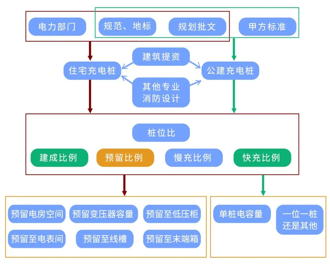 桩位比: 规定新建住宅小区停车位建设或预留安装充电设施接口的比例应达到100%。 建成VS预留: 关于建成比例和预留比例。 如何预留?每个地区、供电部门、规划部门可谓各施各法,尤其是供电部门的要求充分发挥地方特色。