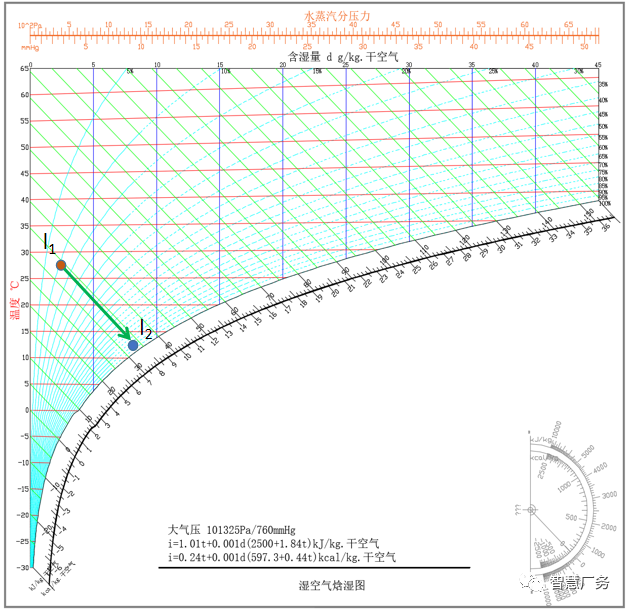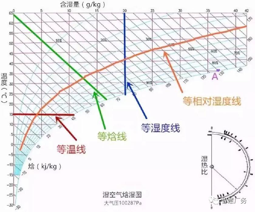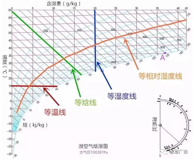 焓湿图:也叫h-d图,表示空气各参数之间关系的线图。焓湿图就像一本字典,你可以根据拼音(某一参数)查字(空气其他参数)。