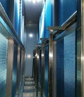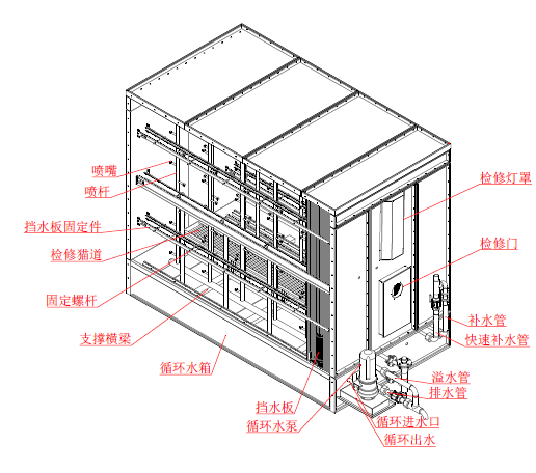 空气流经前挡水板均流后进入喷淋室后流经喷水排管,与喷嘴中喷出的水滴相接触进行热湿交换,可同时实现加湿、水洗空气、调节空气温功能,被水清洗后,空气经后挡水板滤水流出。