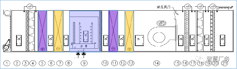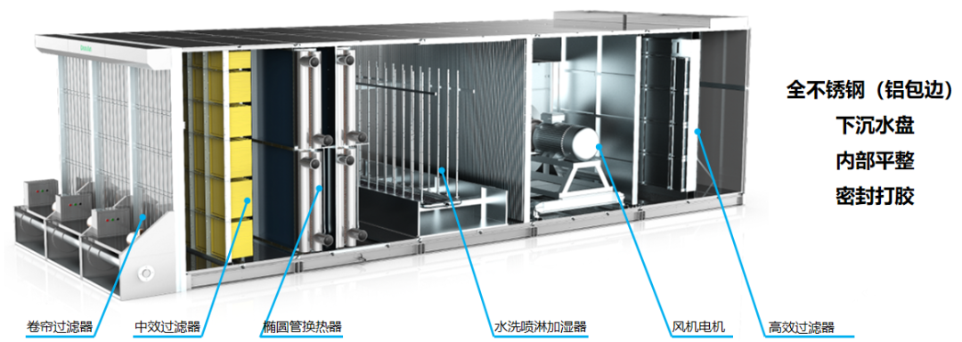 初中效过滤—预热盘管—水洗加湿—再热盘管—风机输送—高效过滤—送风