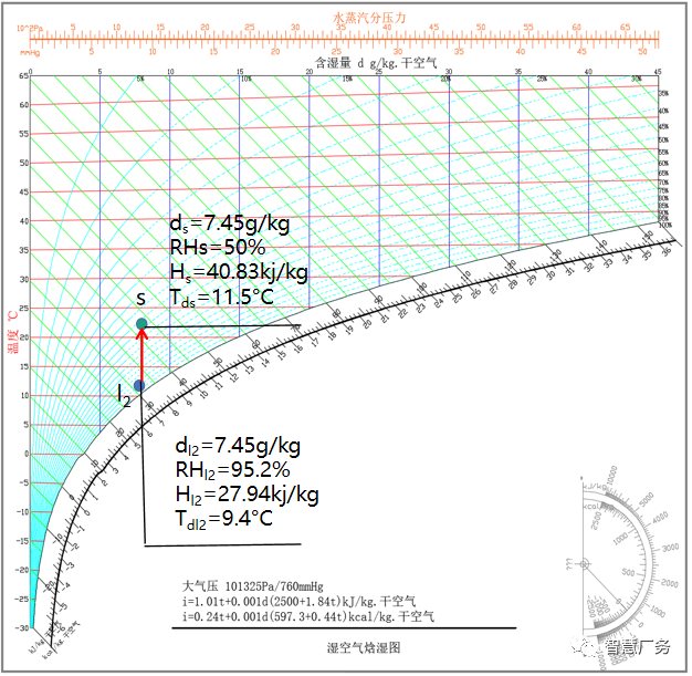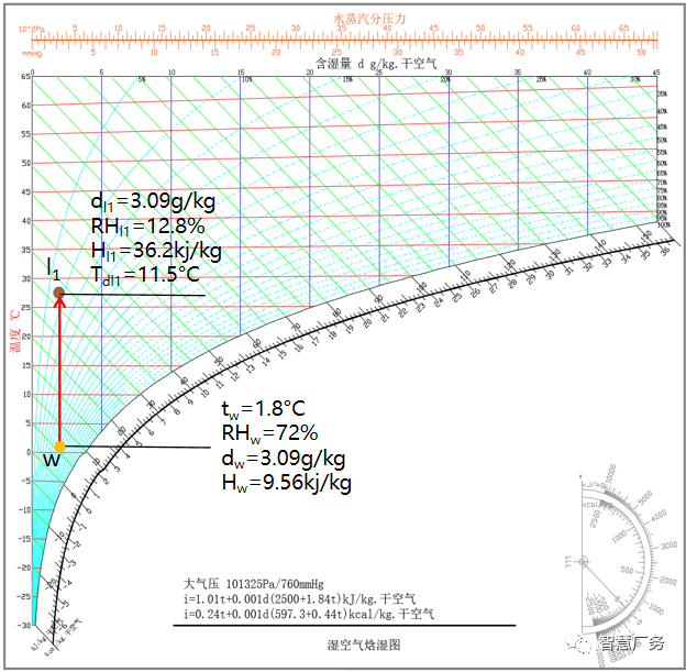 说明:冬季外气低温低湿,为满足房间设定的温湿度要求,须同时保证升温和加湿 的能力达到要求,可通过加热盘管和加湿设备满足要求。水加湿由于是等焓降温过程,要求预热量较大,预热量须能够使空气经过等焓加湿后达到房间空气露点要求。由于水加湿后湿度较大,温度降低,须通过再热盘管加热升温至房间温度要求。