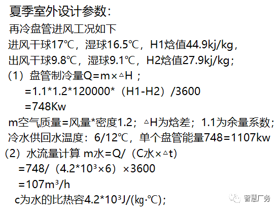 说明:夏季外气高温高湿,为满足房间设定的温湿度要求,须同时保证降温和除湿的能力达到要求,可通过冷水盘管满足要求,一般首先保证房间湿度要求,这要求空调箱再冷盘管的离风温度达到房间条件的露点温度要求,即除湿后的空气绝对含水量等于或小于房间含水量,根据这个要求来计算空调箱冷却能力。由于满足除湿造成送风温度过低,则须要再热盘管适当升温至房间干球温度。