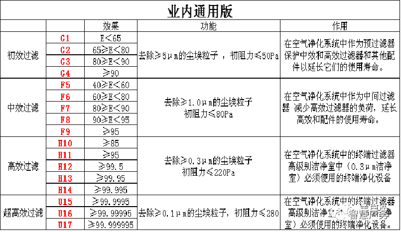 空气过滤器规格中的G,F,H,U是等级的划分,确切来说是根据欧标的等级划分。空气过滤器不同的国家有不同标准,我国国家标准分为初效过滤器,中效过滤器,高效过滤器三个等级,欧洲标准分为G、F、H、U四个等级。U是指超高效;H是普通高效;F是中效;G则对应的是初效。(如下图所示)