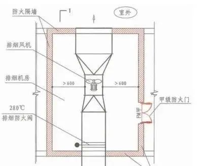 排烟风机宜设置在系统的最高处,烟气出口宜朝上。排烟风机应设置在专用机房内,且风机两侧应有600mm以上的空间。