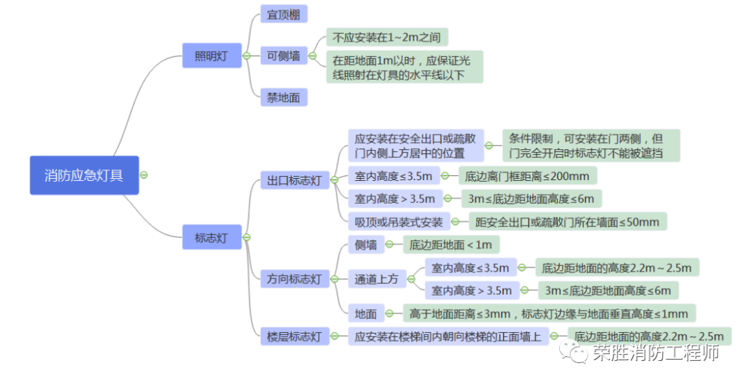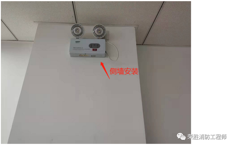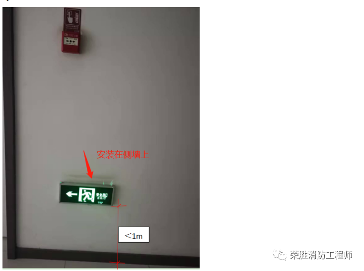(1)侧墙:安装在疏散走道、通道两侧的墙面或柱面上时,标志灯底边距地面的高度应小于1m。