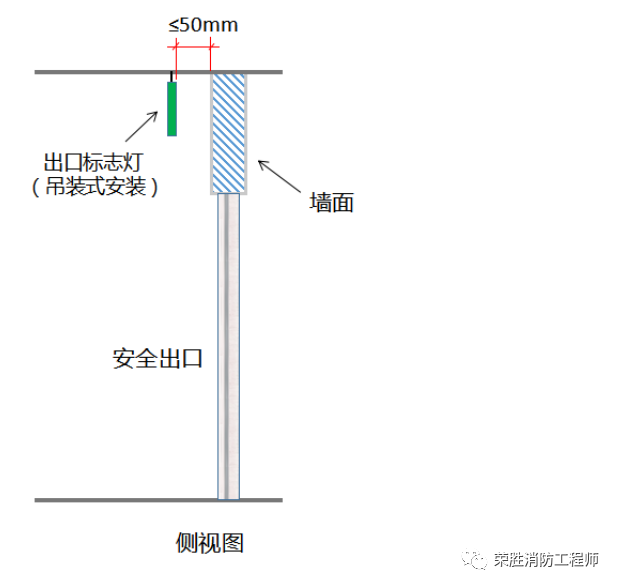 (3)采用吸顶或吊装式安装时,标志灯距安全出口或疏散门所在墙面的距离不宜大于50mm。