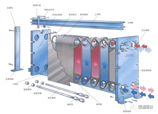 主要组成部分:传热板片,固定盖板,活动盖板,定位螺栓,压紧螺栓等。