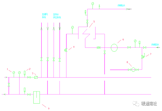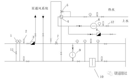 工作流程:热网蒸汽首先进入分汽缸1,然后根据各类热用户要求的工作压力、温度。经减压阀(或减温器)调节后分别输送出去。