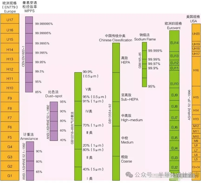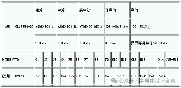 欧洲现行空气过滤器等级标准分类,如下图,根据不同的材质,有不同的测试方法: