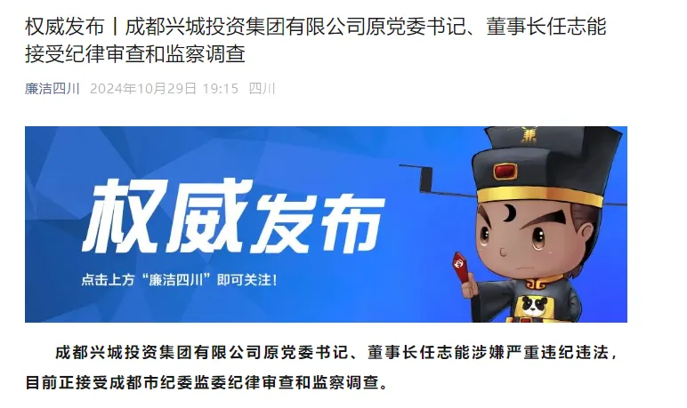 10月29日,成都市纪委监委发布消息,成都兴城投资集团有限公司原党委书记、董事长任志能涉嫌严重违纪违法,目前正接受审查调查。