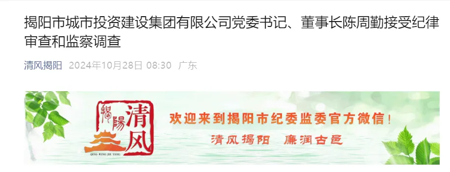 10月28日,广东揭阳市城市投资建设集团董事长陈周勤被查;