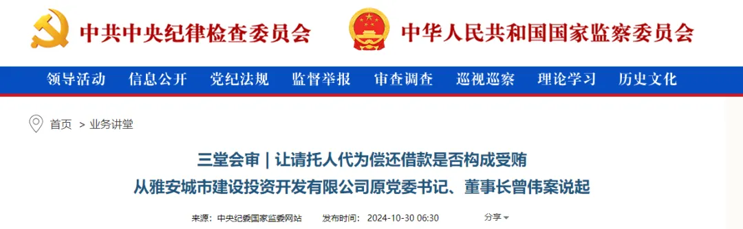 10月30日,中央纪委国家监委网站发布《三堂会审 | 让请托人代为偿还借款是否构成受贿》,雅安城市建设投资开发有限公司原党委书记、董事长被判处有期徒刑六年六个月。
