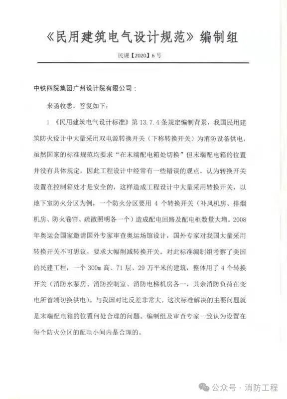 1、《民用建筑电气设计标准》第13.7.4条规定编制背景,我国民用建筑防火设计中大量采用双电源转换开关(下称转换开关)为消防设备供电,虽然国家的标准规范均要求“在末端配电箱处切换”,但末端配电箱的位置并没有具体规定,因此工程设计中经常有一些错误的观点, 认为转换开关设置在控制箱处才是安全的,这样造成工程设计中大量采用转换开关,以地下室防火分区为例,一个防火分区要用4个转换开关(补风机房、排烟机房、防火卷帘、疏散照明各一个)造成配电回路及配电柜数量大增。2008年奥运会国家邀请国外专家审查奥运场馆设计,国外专家对我国大量采用转换开关不可思议,要求大幅削减转换开关。对此标准编制组考察了美国的民建工程,一个300m高、71层、29万平米的建筑,整体用了4个转换开关(消防水泵房、消防控制室、消防电梯机房各一,其余消防负荷在变电所首端切换供电)。与我国对比反差非常大。这次标准解决的主要问题就是末端配电箱的位置何处合理的问题。编制组及审查专家一致认为设置在每个防火分区的配电小间内是合理的
