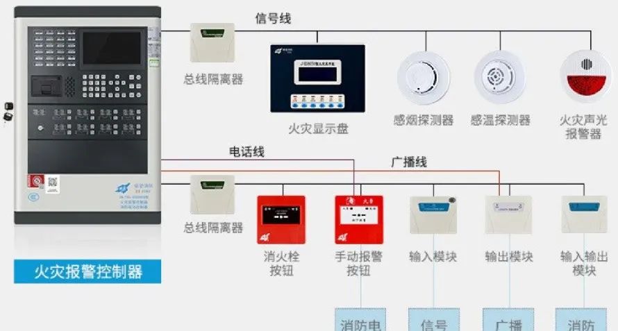注:区域系统组成中还可包括消防控制室图形显示装置和指示楼层的区域显示器。