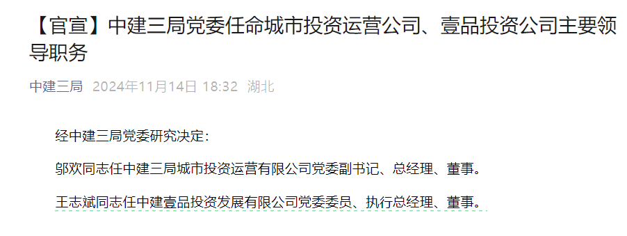 经中建三局党委研究决定:王志斌同志任中建壹品投资发展有限公司党委委员、执行总经理、董事。