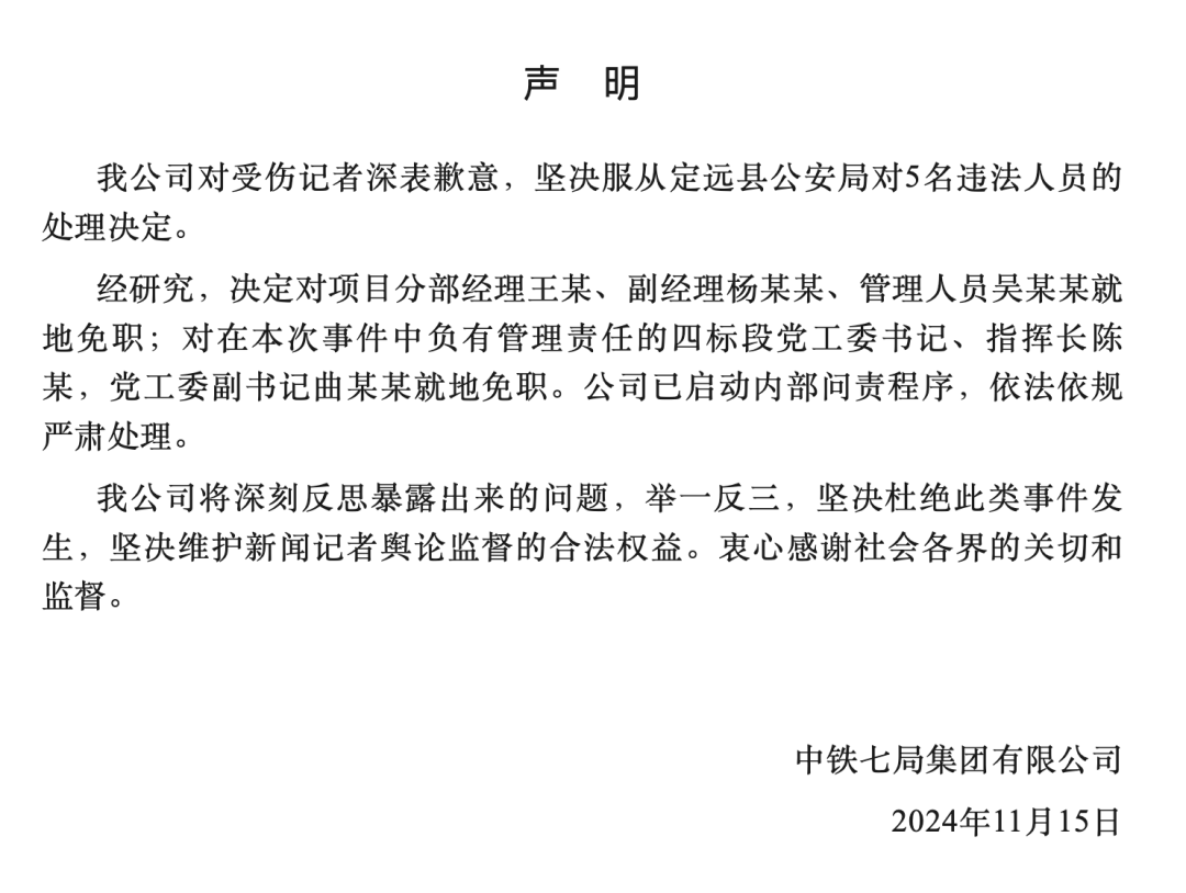 11月15日,中铁七局集团有限公司就新华社记者被袭一事再次发布声明: