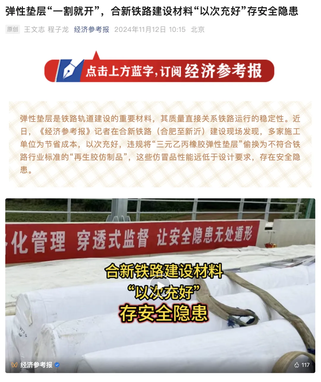 11月12日,新华社《经济参考报》刊发调查报道《弹性垫层“一割就开”,合新铁路建设材料“以次充好”存安全隐患》一文。