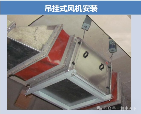 吊挂式风机安装如果风机顶部离楼板距离小于300mm,采用圆钢吊杆上设弹簧减振器,减振器应设置于风机顶部以上位置,吊杆与风机外壳应有50-100mm的距离。若大于300mm,采用角钢或者槽钢制作防晃式吊架框。