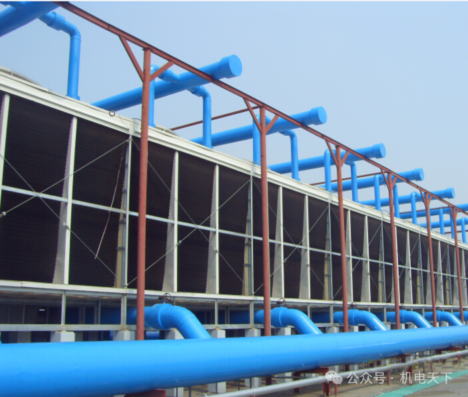 冷却塔处于太阳暴晒的冷却水管可根据当地气象条件建议设计变更,保温后做保护壳,保护管道,提高制冷机组效率。