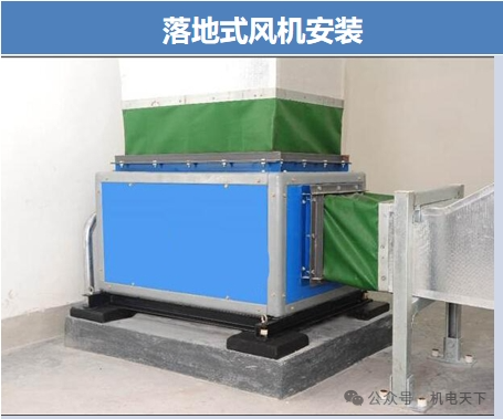 设备基础必须经过交接验收,其大小、平整度应满足设备安装要求。风机与基础接触处应有橡胶减振垫或弹簧减振器等减振措施,且减振电或弹簧应考虑动荷载。