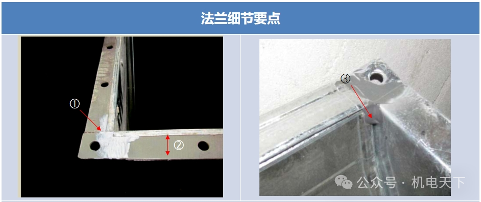 ②风管法兰铁皮翻边量大于6mm,小于9mm;翻边紧贴法兰,平整、无翘起,风管四角铁皮重叠处铲平无豁口,打胶严密。