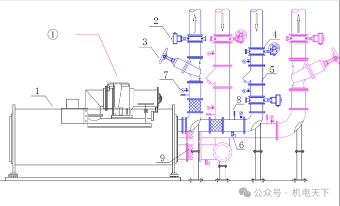 冷水机组常规接管图::1-冷水机组2-电动阀3-平衡阀4-蝶阀5-Y 型过滤器6-泄水阀7-压力表8-温度计9-软接头。