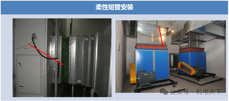 空调风机与风管应采用柔性短管连接,两边法兰应同轴平行、不错位,短管长度为150mm-300mm。柔性短管采用绿色防水、防尘、防霉、阻燃功能的帆布。