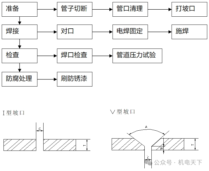 坡口机开口,标准美观;坡口氧化层与杂质打磨干净,坡口根部留有3mm缝隙,便于焊透,管道组对平直,无错边,开完坡口后要及时焊接。