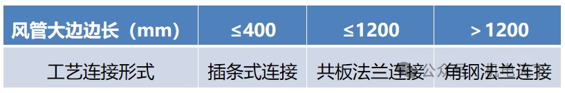 根据施工现场具体情况,采用角钢法兰、共板法兰和插条式连接三种工艺连接或者联合使用。工艺及风管边长划分、风管钢板厚度如下: