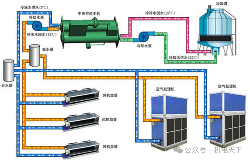 典型中央空调机组主要由冷冻水循环系统、冷却水循环系统及主机三部分组成: