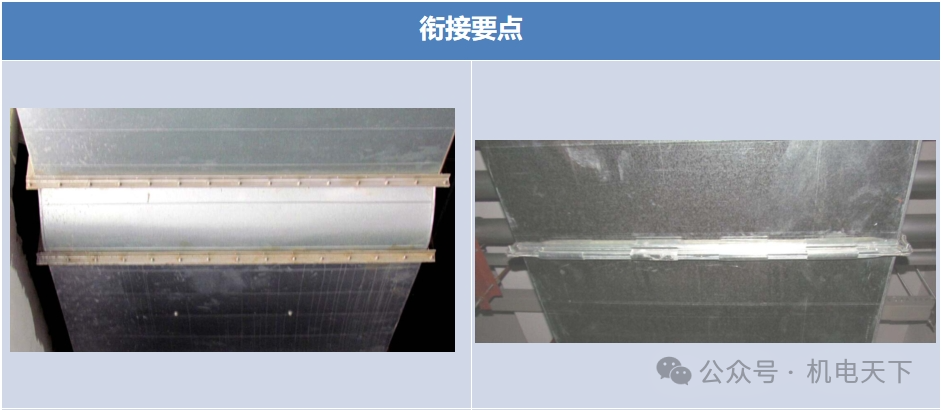 共板法兰风管法兰卡应无毛刺、规格一致、铁皮厚度与尺寸应满足图集要求;法兰卡应该一正一反安装,便于更好受力,相邻法兰卡边缘间距为80mm。