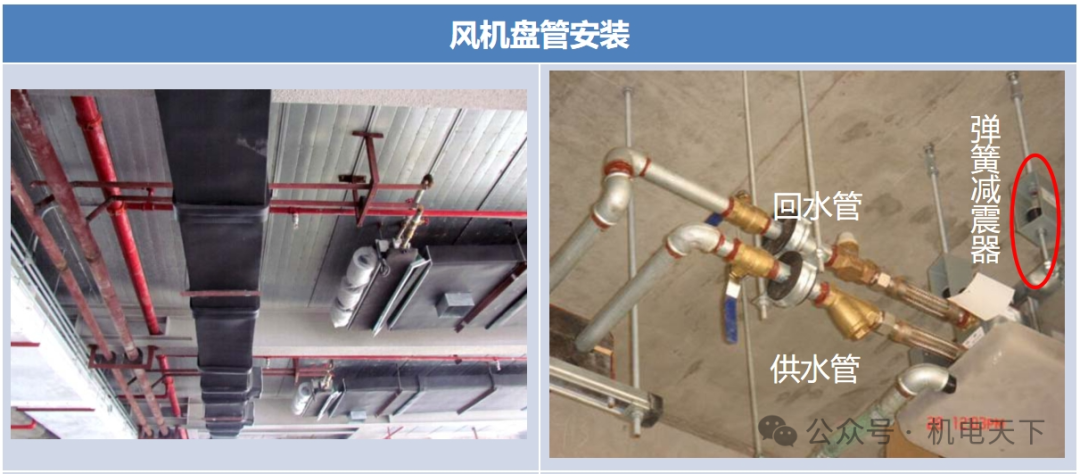 风机盘管尽量贴近楼板水平安装,顶部留出100mm 以上空间操作与检修即可。便于管道系统排气泄水以及冷凝水坡度要求。风机盘管安装应该注意在前后与下部留出送回风管与风口安装空间。