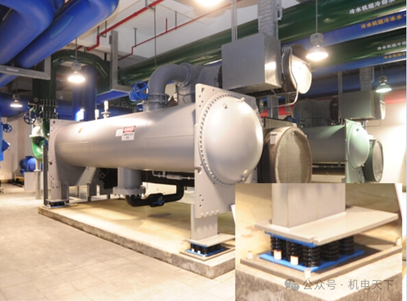 在弹簧减震器下部设置水平度调整钢板,便于设备一次就位 。机组找平可根据设备的具体外型选定测量基准面,用水平仪测量,拧住地板上的螺栓进行调整,机组纵向、横向的水平偏差均不大于1/1000。