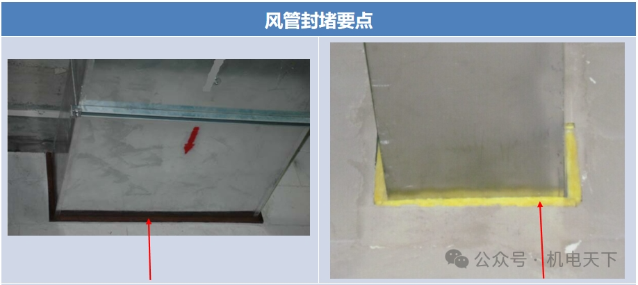 风管穿越防火墙应设有钢板厚度1.6mm 及以上的套管。套管内部应用玻璃棉等不燃材料封堵,外面用防火泥抹面。