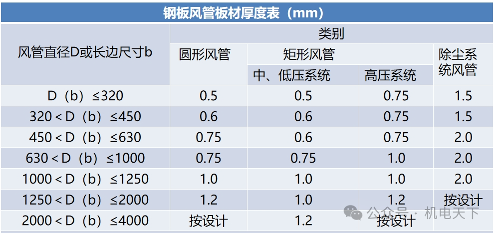 注: 1、螺旋风管的钢板厚度可适当减小10%~15%。2、排烟系统风管钢板厚度可按高压系统。3、特殊除尘系统风管钢板厚度应符合设计要求。4、不适用于地下人防与防火隔墙的预埋管。