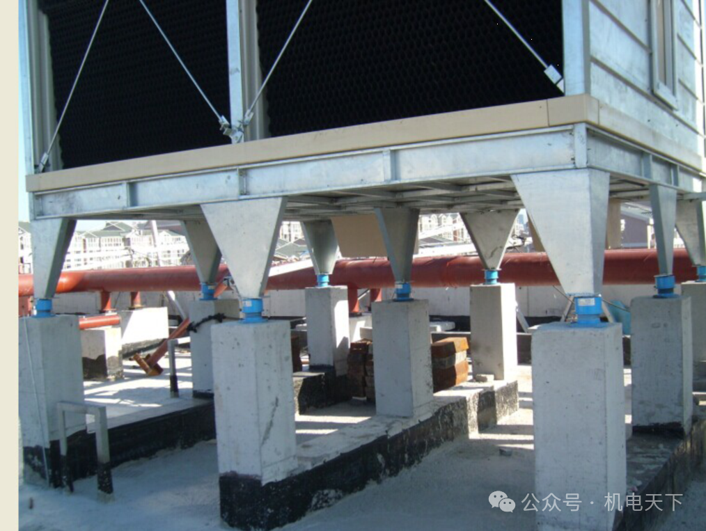 冷却塔基础尺寸标高、强度均应满足要求基础高度按管道安装要求而定。基础经过找平找正后安装减振装置,减震装置与设备及基础螺栓固定。