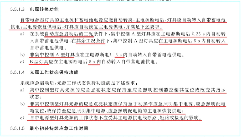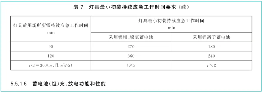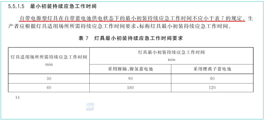 11.自带电源型灯具的最小初装持续应急工作时间要求;
