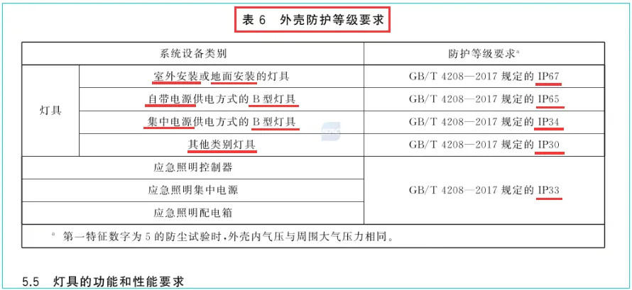 8.灯具及应急照明配电箱、应急照明集中电源的外壳防护等级:室外安装或地面安装-IP67;自带电源B型灯具-IP65;集中电源B型灯具-IP34;其他灯具-IP30;应急照明控制器/应急照明集中电源/应急照明配电箱-IP33。