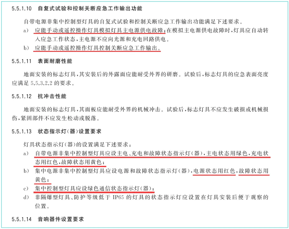 13.自带电源非集中控制型灯具应具有自复式试验和控制关断应急工作输出功能。灯具状态指示灯设置要求:(1)自带电源非集中控制型灯具:主电状态绿色,充电状态红色,故障状态黄色;(2)集中电源非集中控制型灯具:电源状态红色,故障状态黄色;(3)集中控制型灯具:绿色通信状态指示灯。